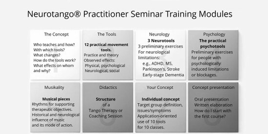 The twelve practical Neurotango Tools are directly structured around nine defined neuroscientific mechanisms. The Neuro Tools and Psycho Tools extend the framework to address neurological and psychosocial dynamics within therapeutic settings.